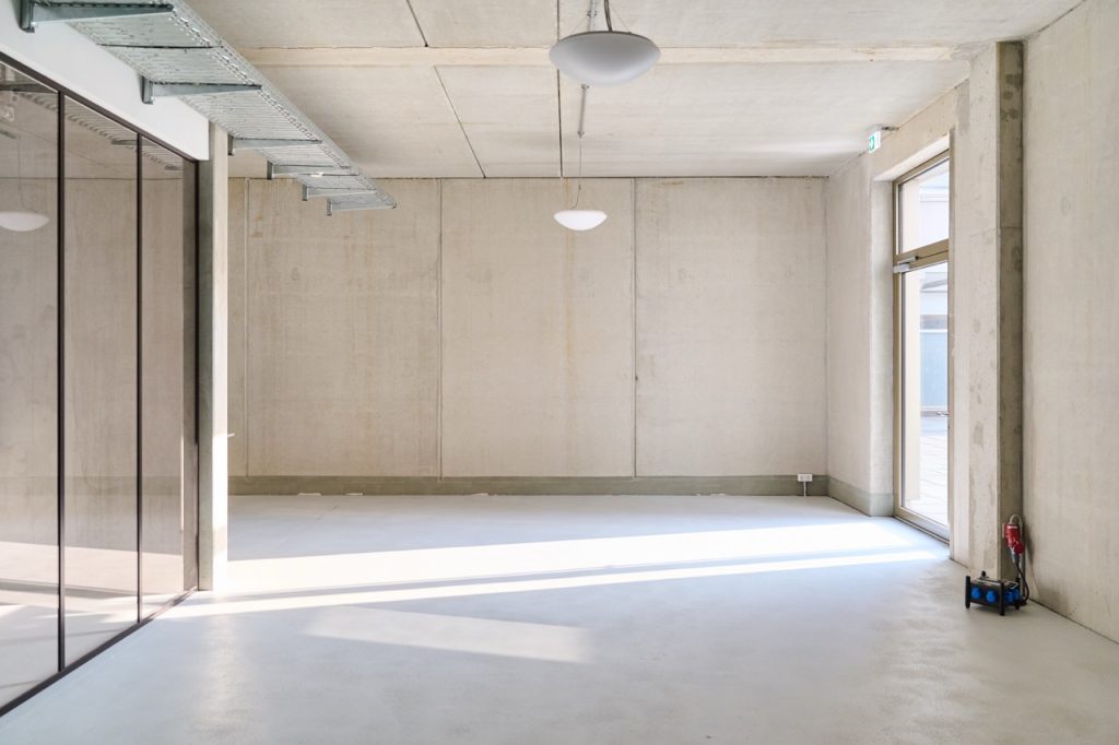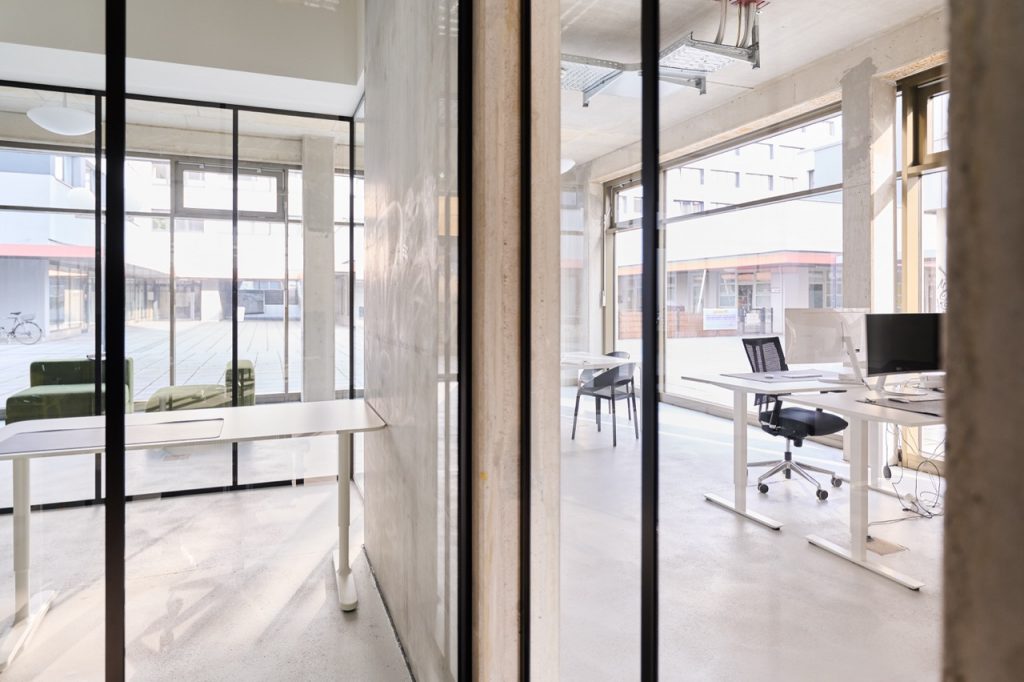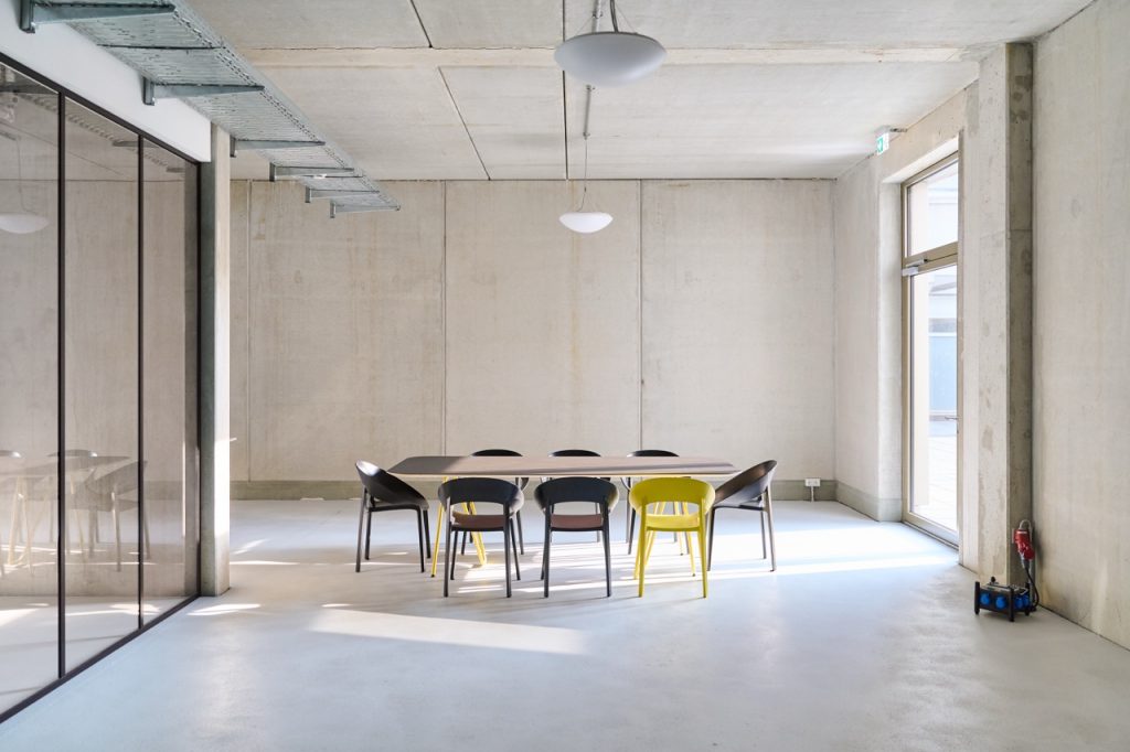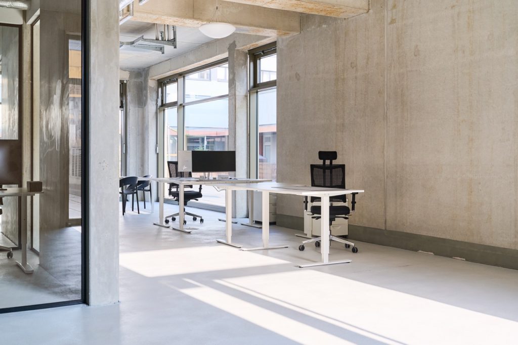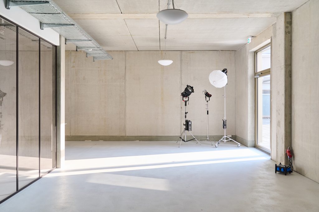 Minimalistisches Design, rohe Betonwände und ein Boden aus Industrieguß. Die Ausstattung ist funktional, das Erscheinungsbild reduziert. Die Umgebung unterstützt fokussiertes Arbeiten und klare Bildsprache.