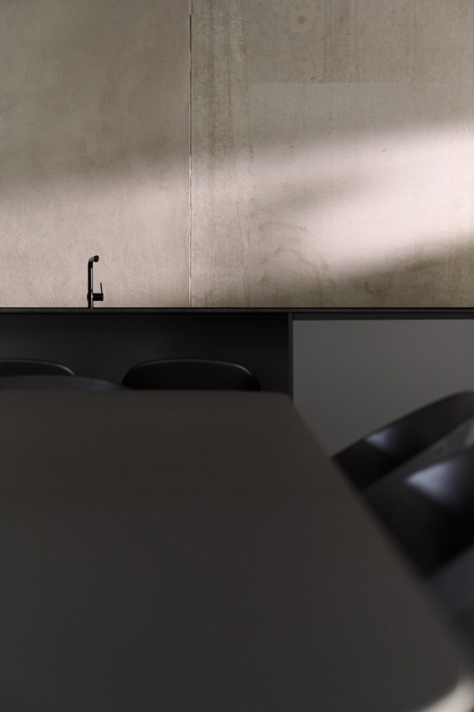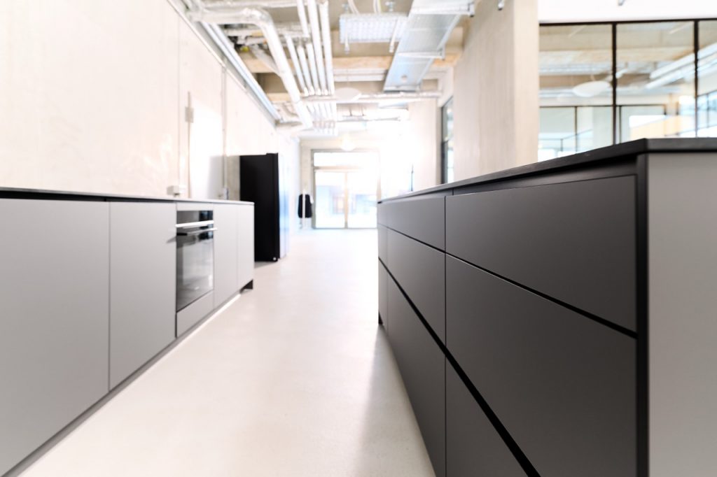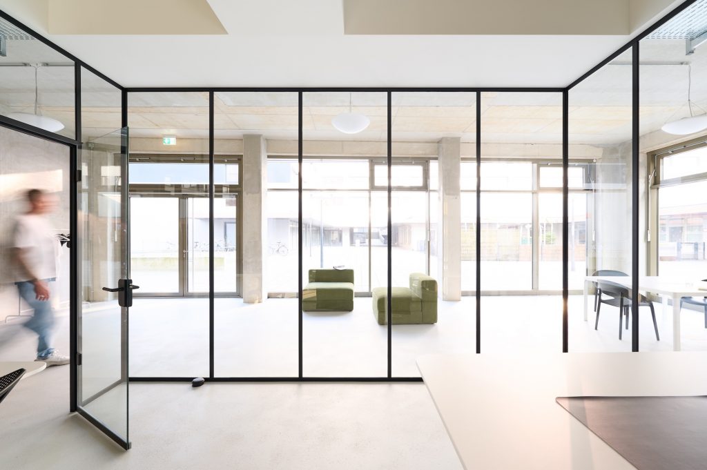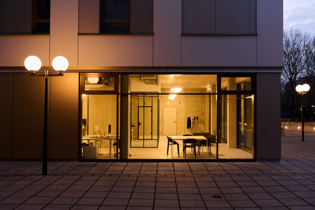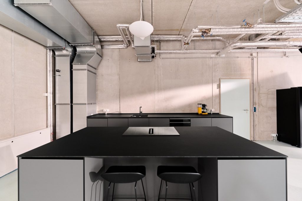 Minimalistisches Design, rohe Betonwände und ein Boden aus Industrieguß. Die Ausstattung ist funktional, das Erscheinungsbild reduziert. Die Umgebung unterstützt fokussiertes Arbeiten und klare Bildsprache.